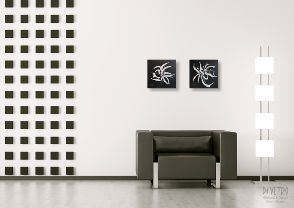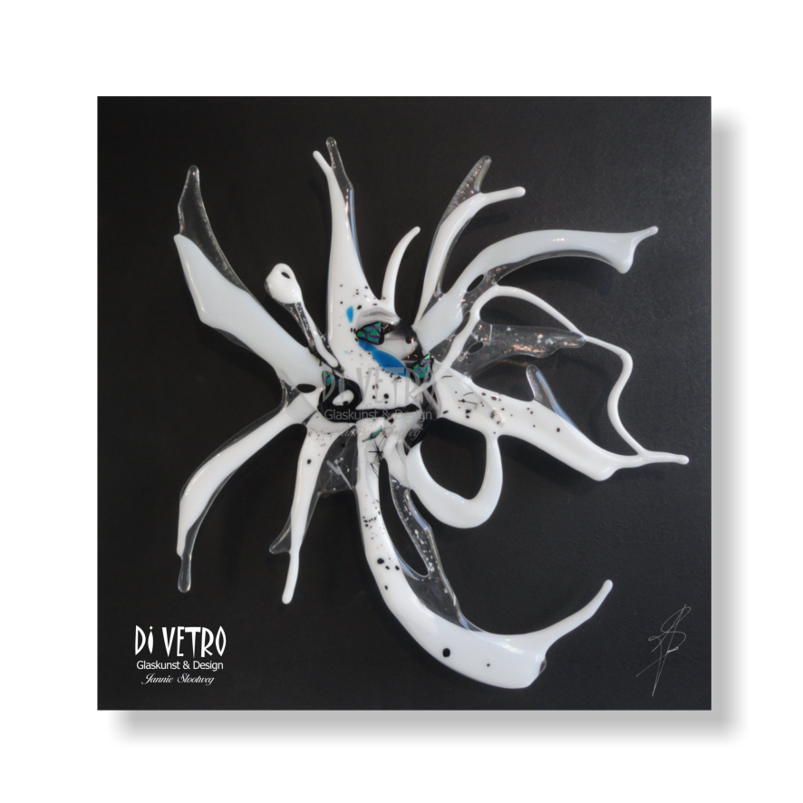 Abstract Glasfusing Wandobject in wit-zwart met turqoise accent op zwart paneel.