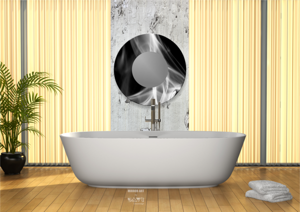 Designspiegel met LED verlichting en kleur met elegant, artistiek-abstract ontwerp.