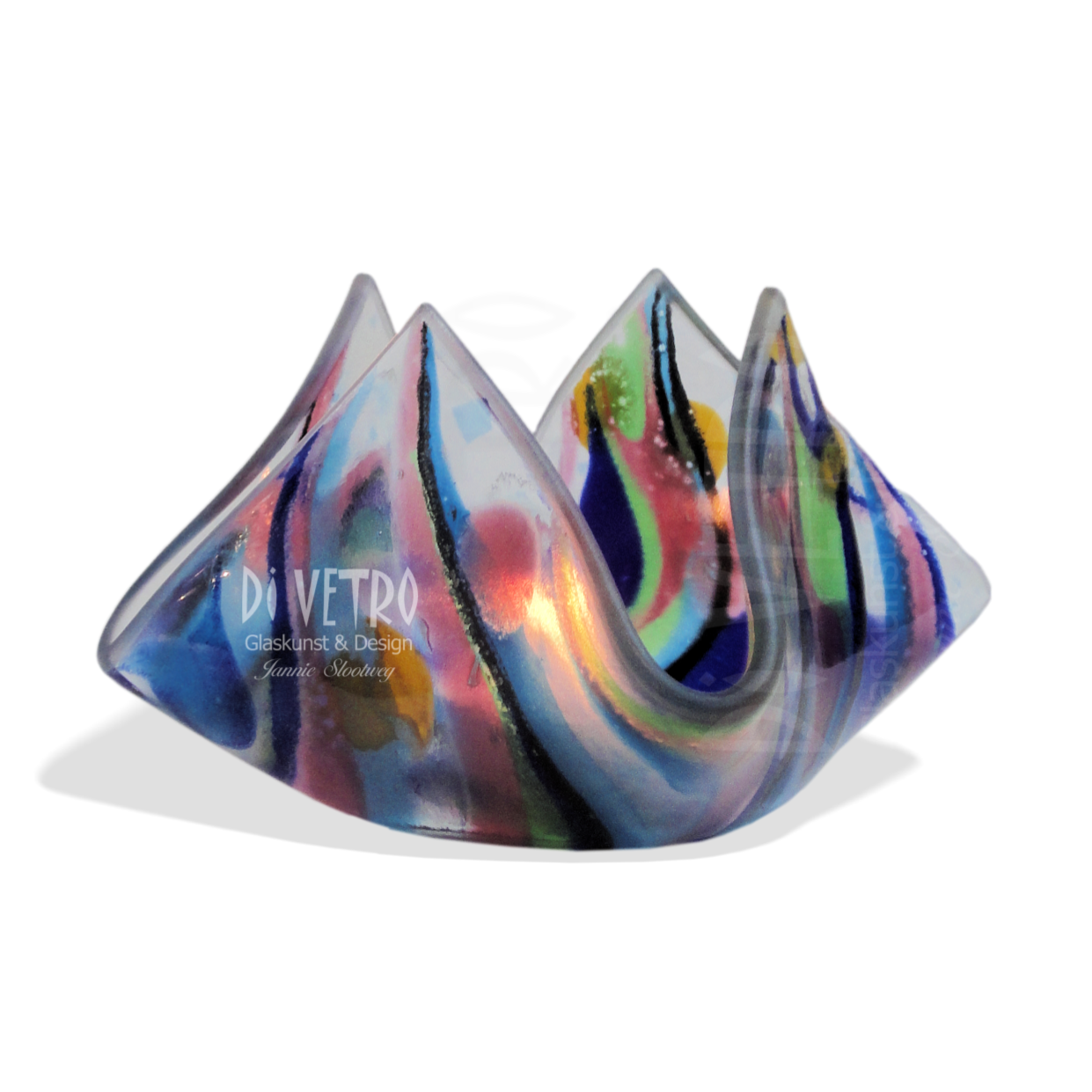 Dat is de omschrijving voor dit handgemaakt, Glasfusing sfeerlichtje, die niet zal misstaan op tafel, dressoir of waar dan ook in uw interieur. Door middel van (waxine)kaarslicht komen de kleuren in het glas nog meer tot zijn recht.